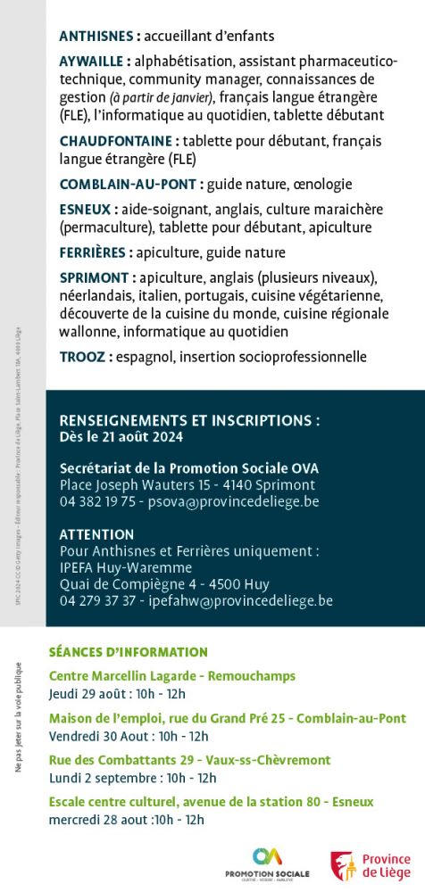 Les inscriptions débutent le 21 août 2024 via : 04 382 19 75 - psova@provincedeliege.be
